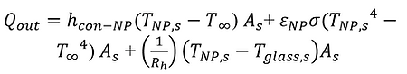 A hypothesized interfacial insulation (Rh) between the nanoscale plasmonic NPs coating and the glazing was incorporated into the conventional heat transfer model. In the stable boundary situations and same ambient temperature conditions, the absorbed solar energy equals the sum of the heat dissipated from the NP-coated surface and the conductive heat transfer away from the NP-coated layer to the glass through the interfacial layer.